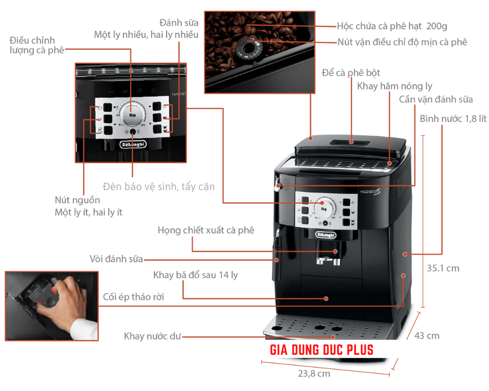 - Máy pha cà phê De'Longhi Magnifica S ECAM 22.110.B không chỉ pha chế cà phê hoàn hảo từ đậu tươi chỉ bằng một nút bấm, mà còn có thể pha đồ uống bằng cà phê xay.