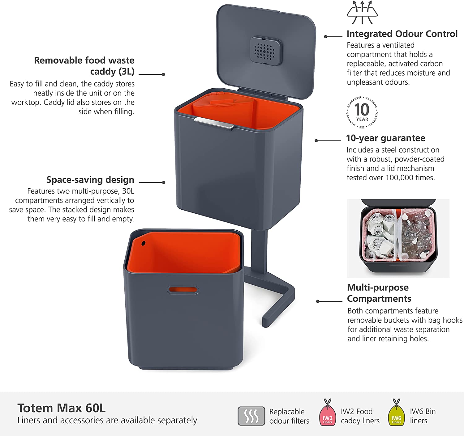 Thùng rác 2 ngăn Joseph Joseph Totem Max 60L thế hệ thứ 2 có thiết kế dạng đứng tiết kiệm diện tích với 2 ngăn để tối đa hóa khả năng tái chế và đựng rác. Có ngăn đựng rác thông thường, ở trên cùng và ngăn tái chế đa năng ở đáy. Mỗi ngăn bao gồm một thùng có thể tháo rời với các móc để cố định lót thùng rác và lỗ thông hơi giúp bỏ túi dễ dàng hơn. Bộ lọc carbon có thể thay thế bên trong nắp giúp loại bỏ mùi hôi.