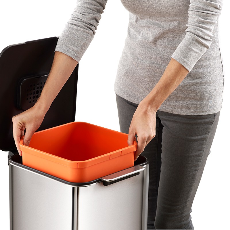 - Một ngăn chứa chất thải chung ở phía trên cho phép dễ dàng truy cập vào thùng bên trong có thể tháo rời. Xô có các góc cạnh để cho phép tháo thùng dễ dàng, móc túi tích hợp để cung cấp thêm ngăn cách rác và lỗ khí để loại bỏ túi dễ dàng hơn.